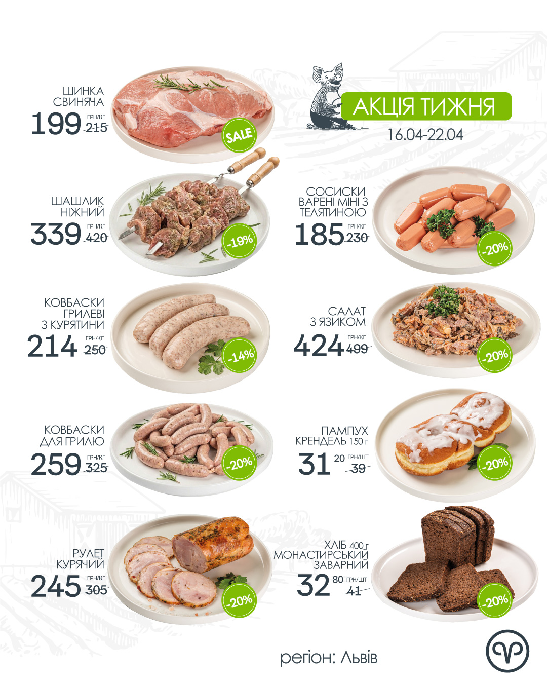 Склад: м'ясна сировина 100% (м'ясо птиці 55%, філе куряче 20%, шкіра куряча 25%), сіль нітритна, вода питна, пшенична клітковина. Суміш спецій (майоран, білий перець, чорний перець, коріандр, кухонна сіль, цукри (декстроза, мальтодекстрин).