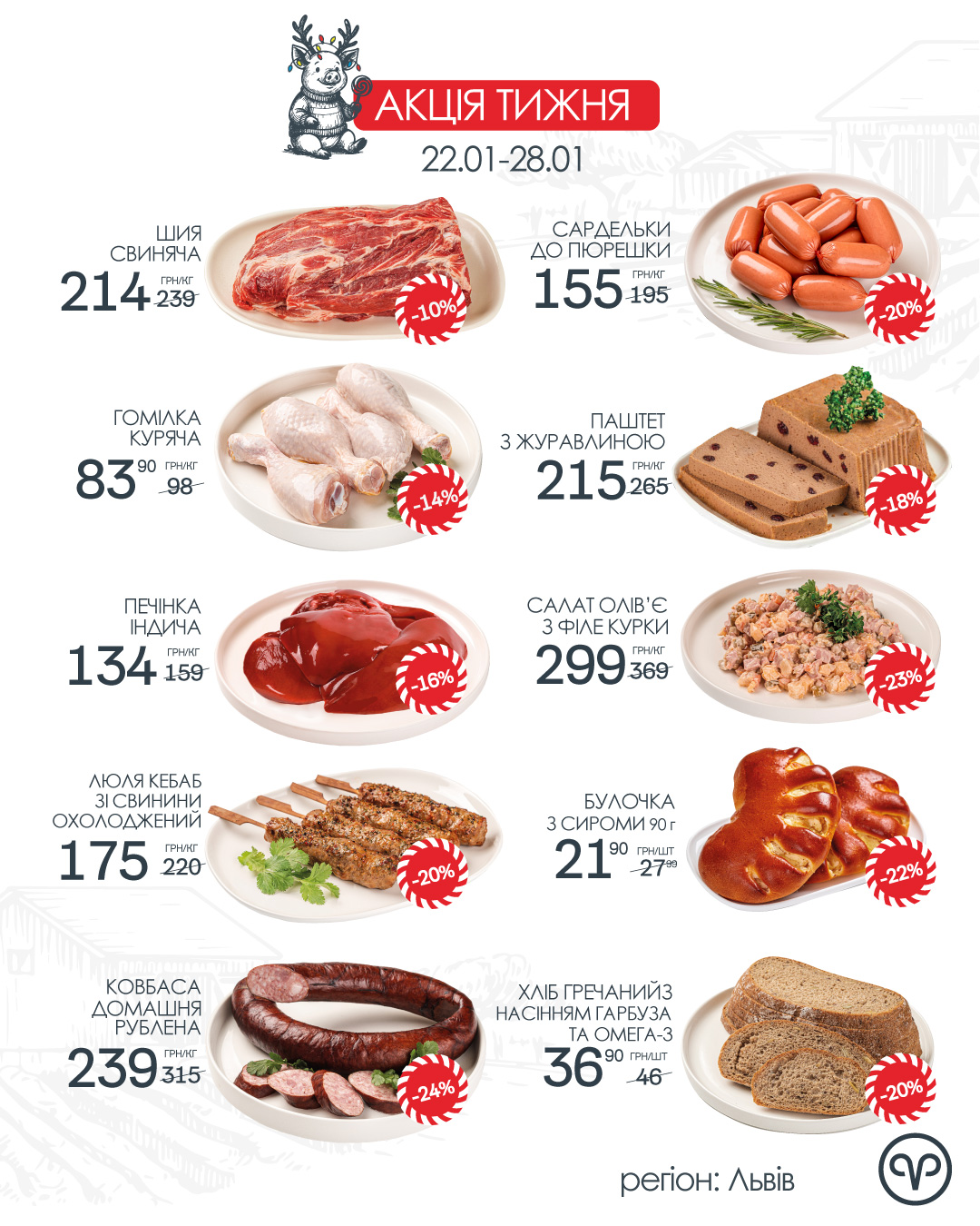 Склад: м’ясна сировина 100% (свинина знежилована жирна – 60%, свинина знежилована напівжирна – 20%, м’ясо птиці (в т.ч. філе) – 20%), сіль кухонна, вода питна, часник сухий, пшенична клітковина, перець чорний мелений. Суміш спецій (паприка, перець чилі, підсилювач смаку (Е621), цукор, мальтодекстрин, трансглутаміназа, гемоглобін свинний, глюкоза, петрушка, цибуля, морква, міститься гірчиця).