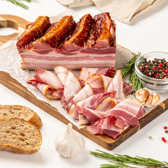 Склад: грудо-реберна частина без ребер, сіль харчова, суміш суха багатокомпонентна (цукри, ароматизатори, перець, паприка, часник).
