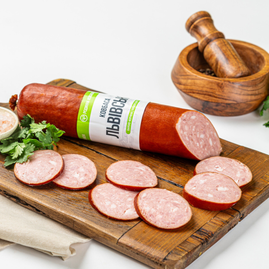 Склад: м'ясна сировина 90,0 % (свинина знежилована напівжирна, свинина знежилована жирна, свинина знежилована не жирна), емульсія шкіри свинної, крохмаль картопляний, сіль нітритна, овочі сушені (часник).