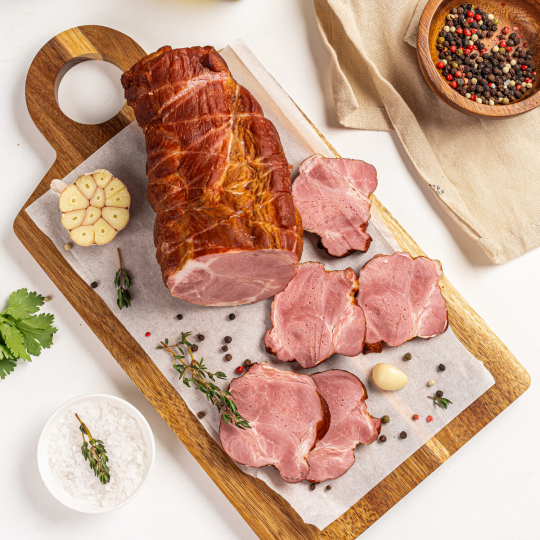 Апетитна страва з добірної свинячої шийки, в якій гармонійно поєднано м’ясота міжм’язевий жир. Приправлена натуральними спеціями та копчена на фруктових дровах, ця шия має виразний смак і аромат справжньої домашньої продукції.