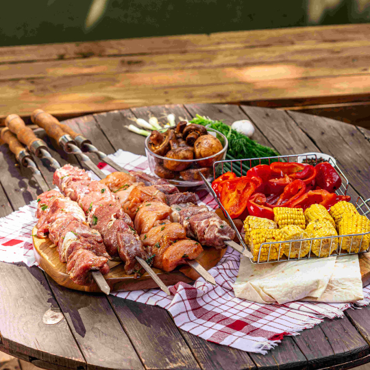 Три види м’яса, які точно не підведуть на вогні: курка в апельсиновому маринаді, свинна вирізка в прянощах і соковита шия в грузинському стилі. Шашлики вже замариновані — залишилось лише приготувати.