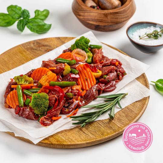 Склад: м’ясна сировина 100% (телятина вищого сорту), капуста броколі, стручкова квасоля, морква, кукурудза міні, перець червоний, перець болгарський, маринад (олія соняшникова рафінована, олія кукурудзяна, олія рапсова, сіль кухонна, перець білий, паприка, цибуля, петрушка).