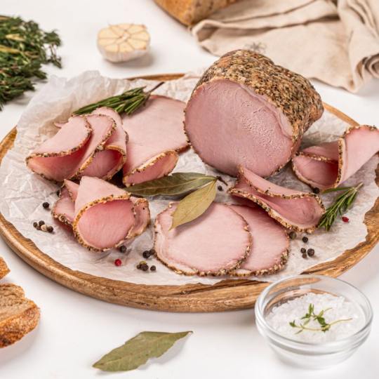Склад: спинний м’яз свинячий 100%, ciль, суміш багатокомпонентна спеції (перець чорний, білий, духмяний, мускатний горіх), часник, цибуля.