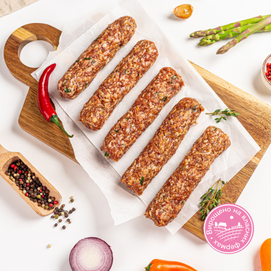 Склад: м’ясна сировина 100% (телятина вищого сорту), сіль нітритна, м’ята свіжа, кінза свіжа, базилік свіжий, перець чорний.
