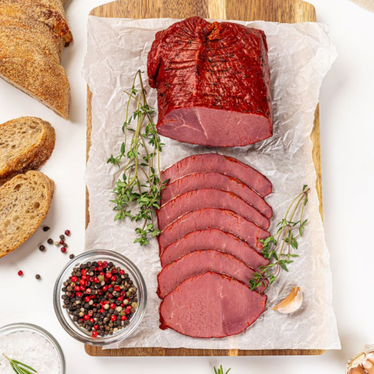 Склад: м'якoть лопаточної чacтини ялoвичини 100%, ciль харчова,цукop-пісоок, суміш суха багатокомпонентна.