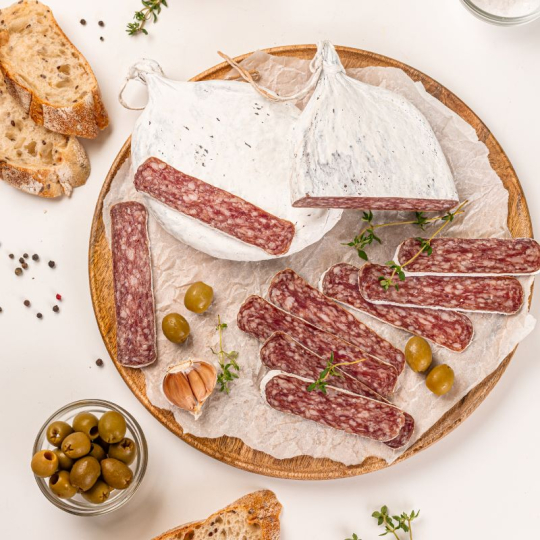 Склад: свинина напівжирна 70%, свинина нежирна 20%, сало бокове 10%, сіль харчова, суміш багатокомпонентна (перець чорний, горіх мускатний, перець духмяний).