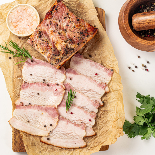 Склад: м'ясна сировина 100% (спинно – реберна частина свинячої півтуші без ребер та шкіри з вмістом жирової тканини – 75%, та м'язової тканини – 25%), вода питна, сіль), перець чорний.
