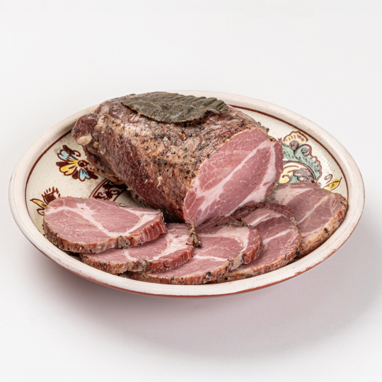 Склад: м’ясна сировина 100% (шия свинна), сіль нітритна, лаврове листя, часник сухий, перець чорний мелений, перець духмяний мелений, коріандр мелений, цукор, регулятори кислотності.